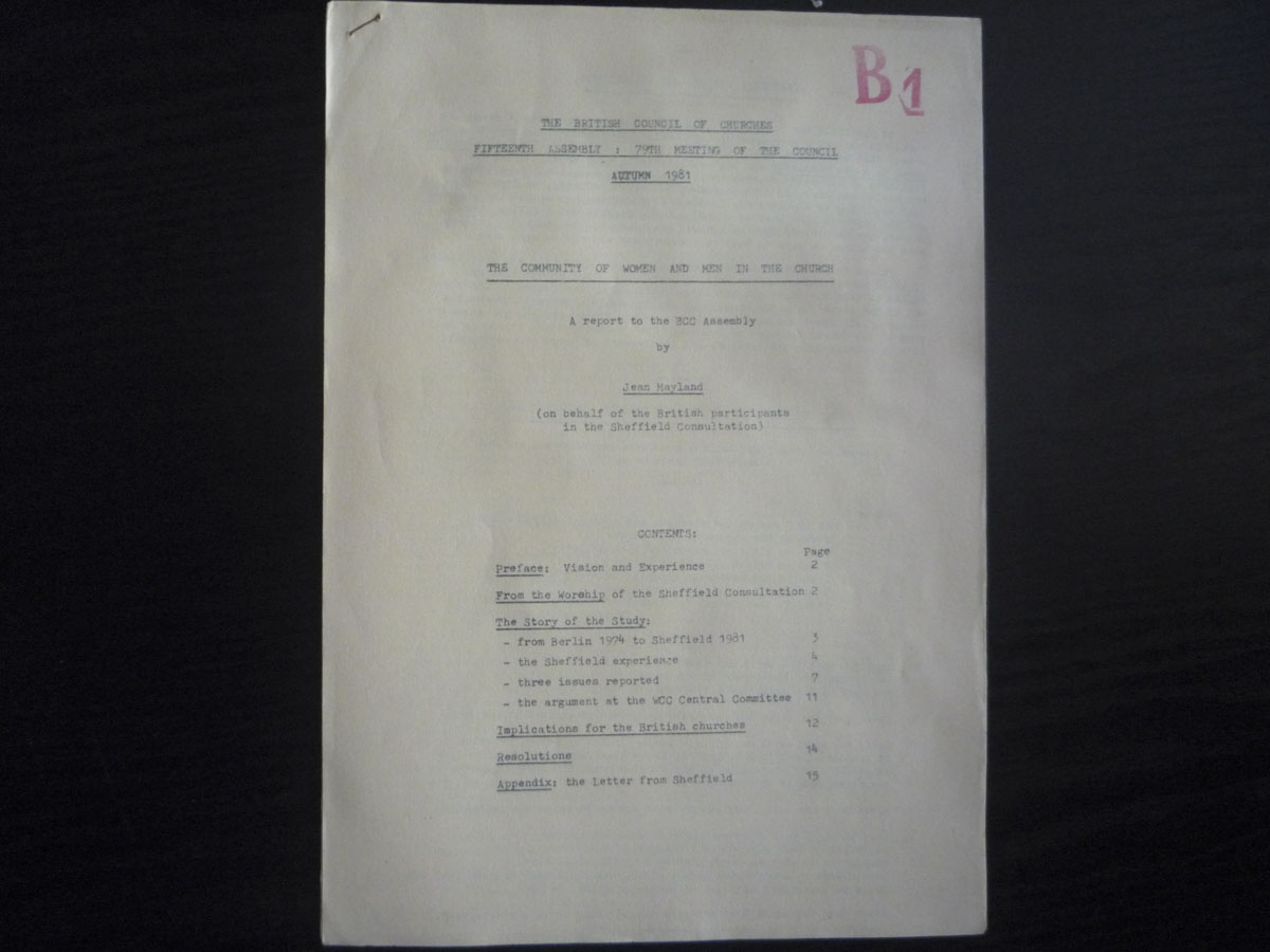 A4 report "The Community of Women and Men in the Church, a Report to the BCC Assembly" 1981 by Jean Mayland