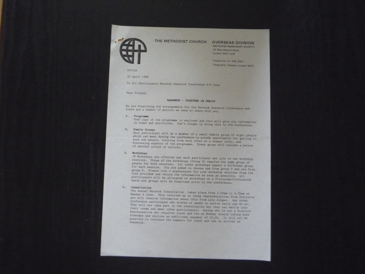 A5 Programme for "Harambee: Together in Christ" Network's Annual Conference at Swanwick 6-9 June 1988, with 6 inserts
