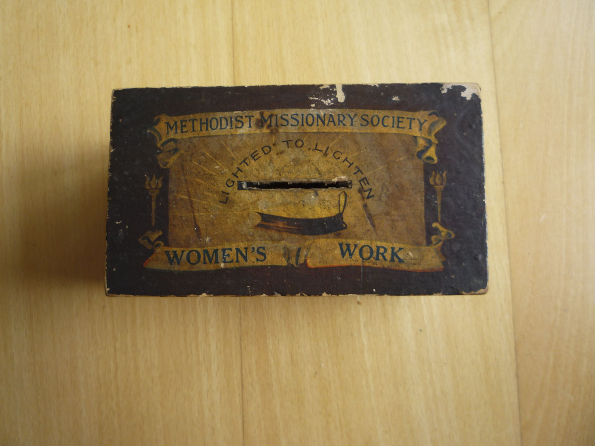 Women's Work Collection Box of the Methodist Missionary Society c1910, plus a fragment of label (stored in a children's shoe box)