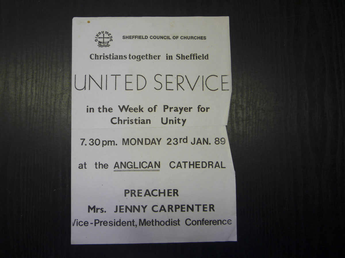 A collection of sundry items (magazines, reports, postcards etc) - poster for the United Service of Christians Together in Sheffield - preacher JC, 29 June 1989