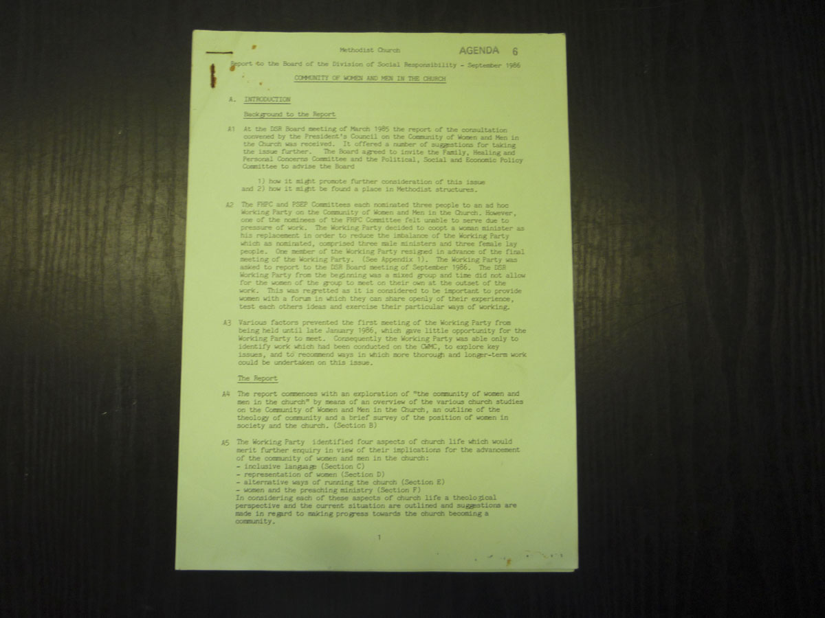 A collection of sundry items (magazines, reports, postcards etc) - Agenda 6 - Report to the Board of Division of Social Responsibility September 1986 - Community of Women and Men in the Church