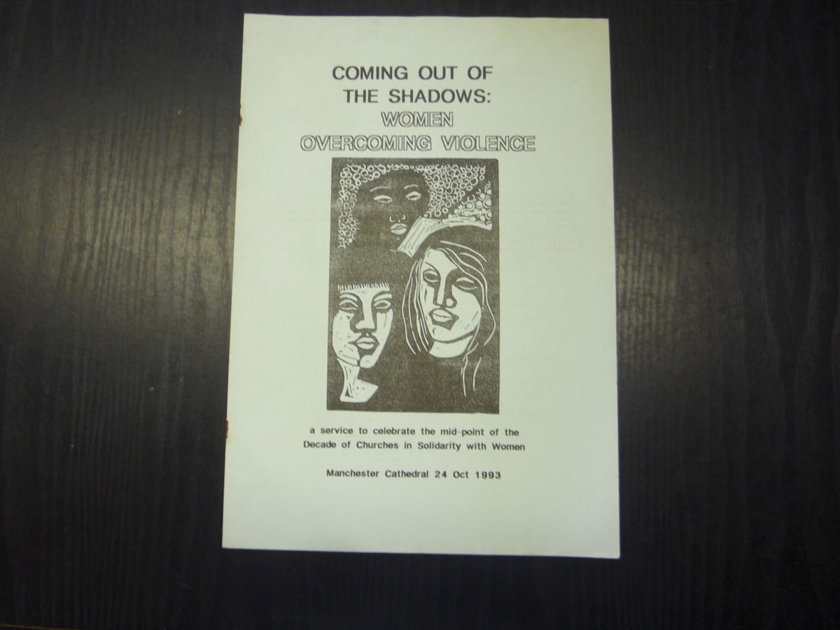 A collection of sundry items (magazines, reports, postcards etc) - A4 booklet - Service Order, "Coming out of the Shadow: Women Overcoming Violence" Manchester Cathedral 24.1.1993