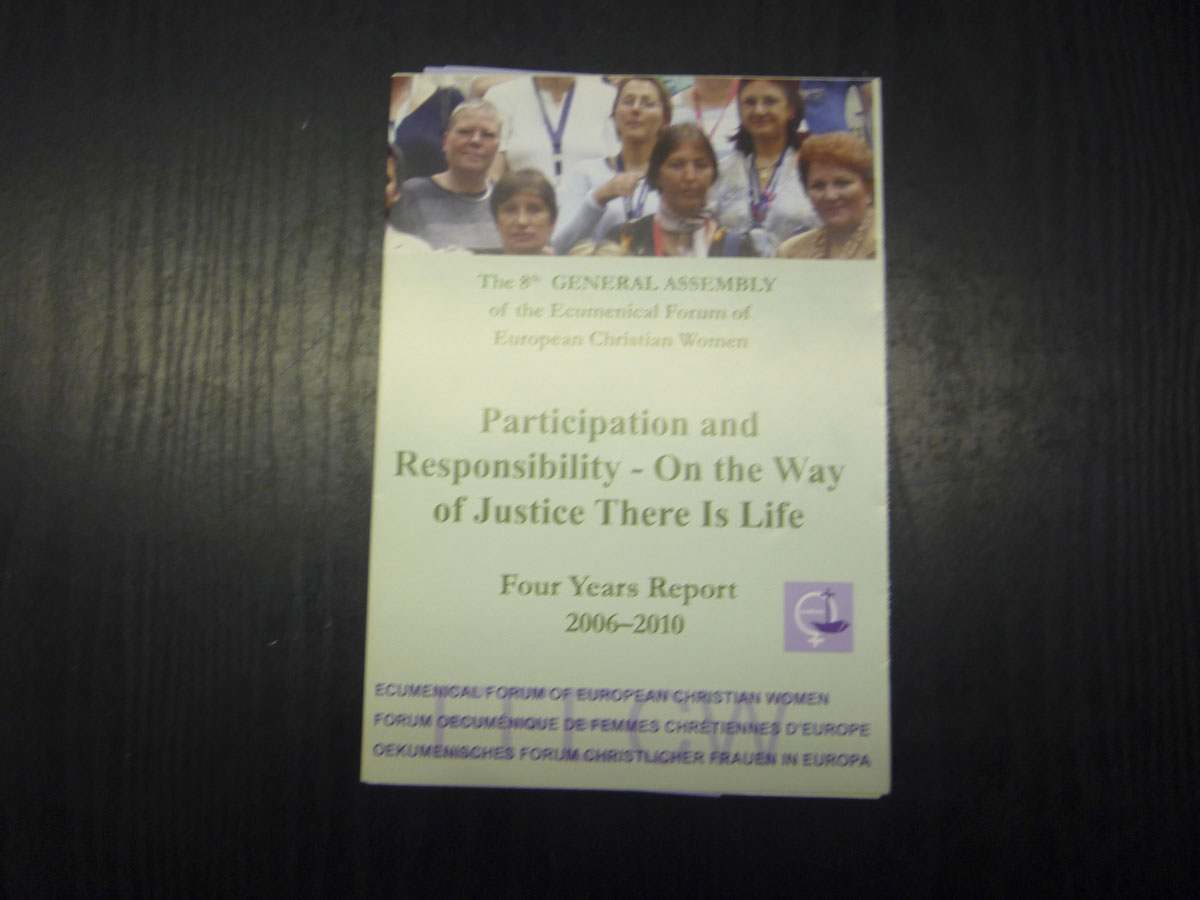 A collection of sundry items (magazines, reports, postcards etc) - A5 booklet "Participation and Responsibility - On the Way of Justice there is Life" A Report from the 8th General Assembly of the Ecumenical Forum of European Christian Women