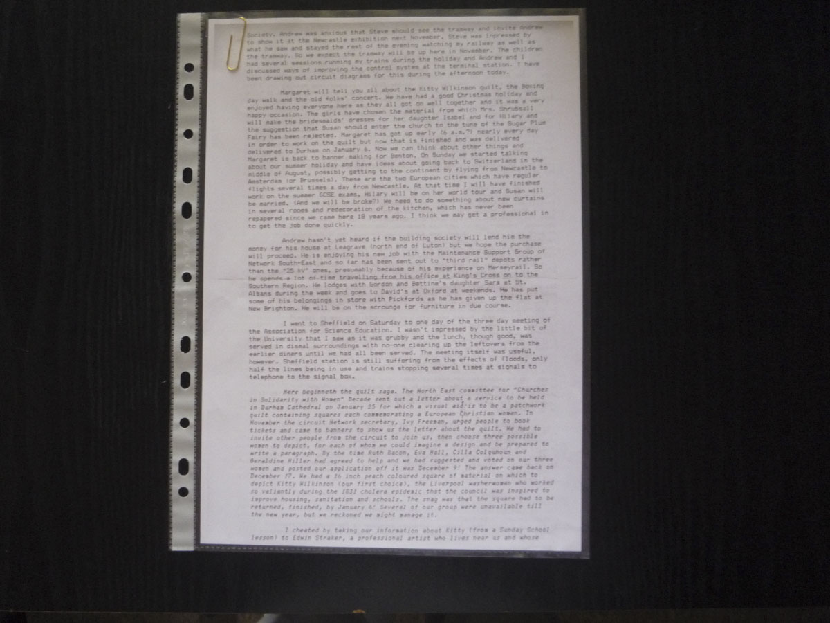 A collection of sundry items (magazines, reports, postcards etc) - photocopied extract from a letter to JC from her sister Margaret Burchell about the Kitty Wilkinson square for inclusion in the Durham Quilt