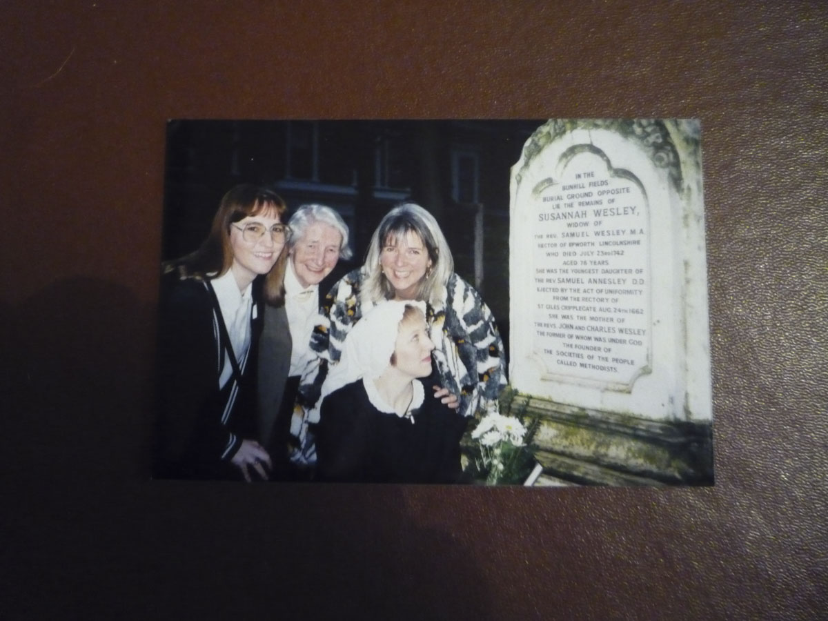 Items relating to Annesley House, c) Photographs of people and events at AH and its predecessors - contained in a wallet labelled "Annesley House 25th Anniversary Service" - Landscape - Sue Dodd, Beth Sloan, Carol Burgess and Veronica Chard at Susanna Wesley's memorial