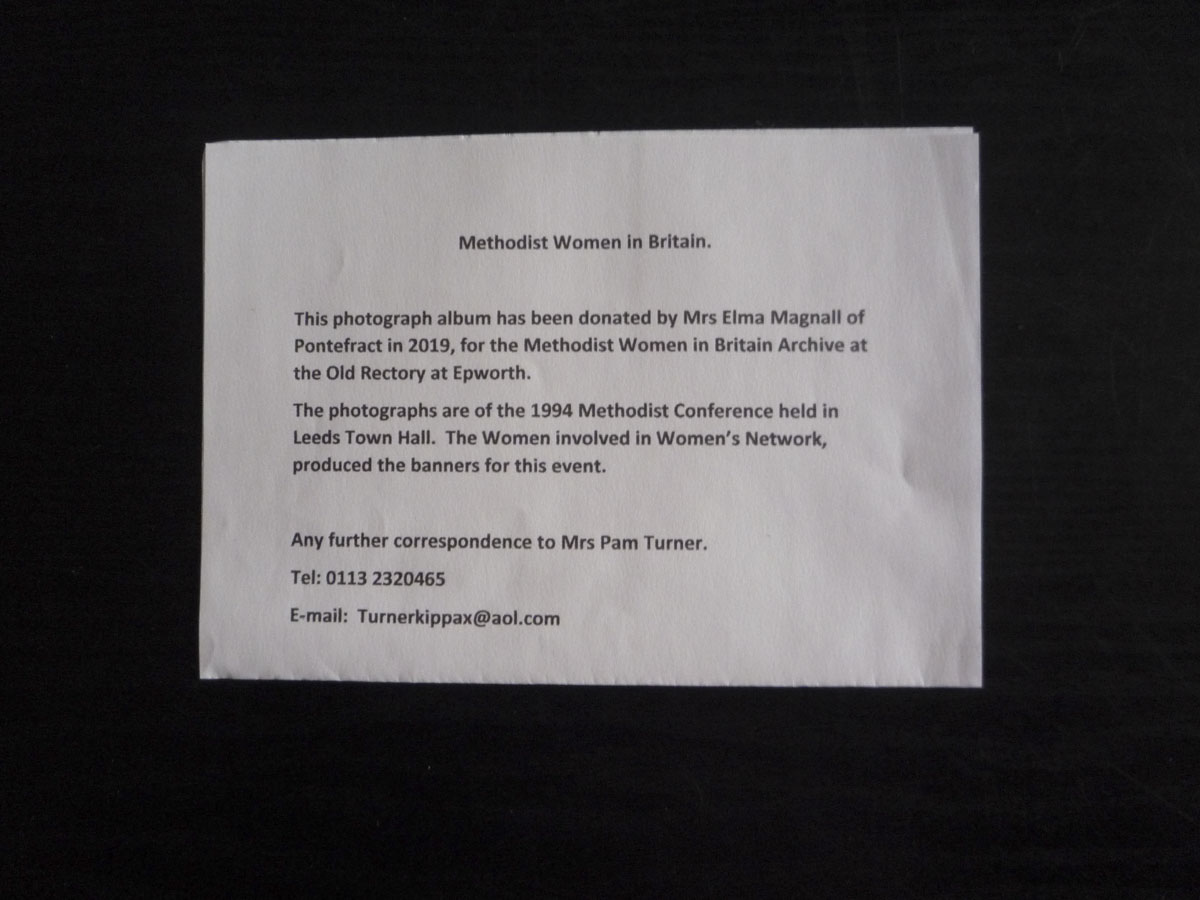 red photograph album containing 63 colour photographs recording the making of the Banner for the Pontefract and Normanton Circuit and some of the people involved.