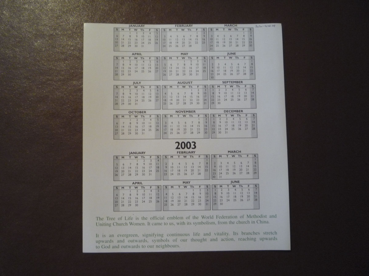 Miscellaneous Items - 2003 calendar produced by the World Federation of Methodist and Uniting Church Women