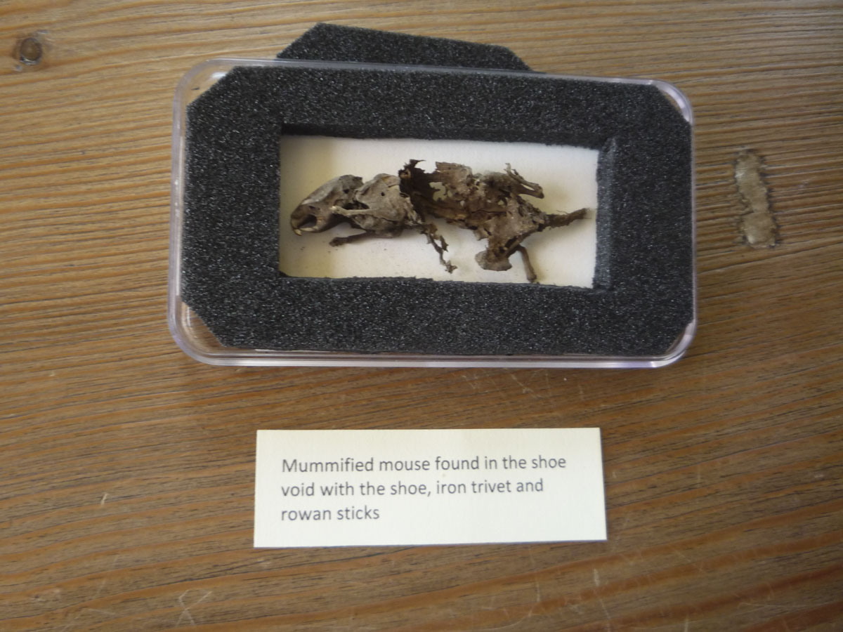 Mummified remains of a complete mouse and a separate mouse skull c. 1709